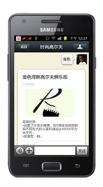 当用户对时尚高尔夫公众平台询问金色时,系统会从服务器数据库找询关于金色的所有信息,并组合成为图文并茂的信息回复自动发送给用户。